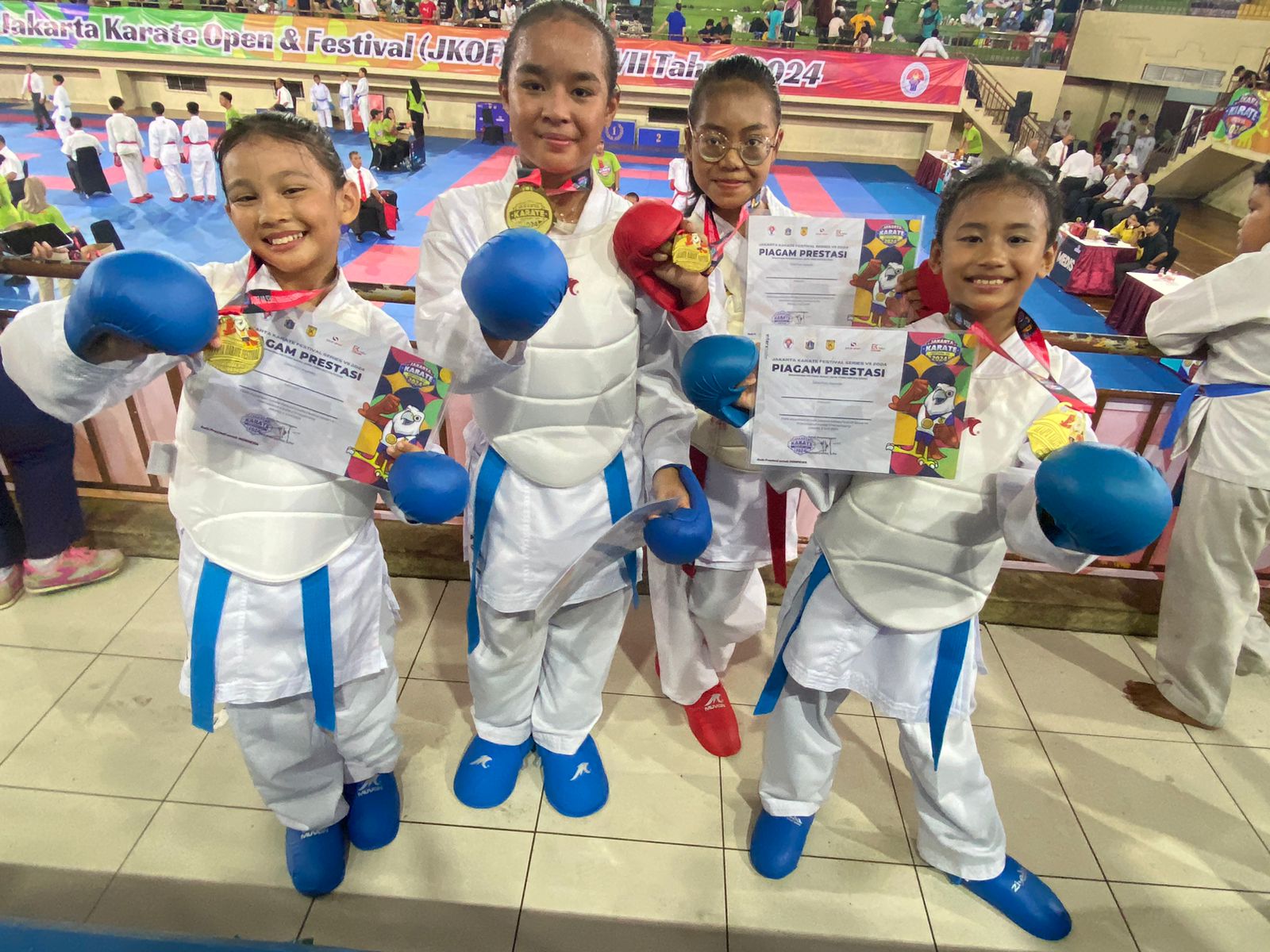Dewan juri yang terdiri dari para ahli karate yang berpengalaman siap menyaksikan pertandingan yang akan datang. Sorak sorai dan tepuk tangan para pendukung setia anak-anak mengisi ruangan saat kompetisi dimulai. Mereka duduk dengan bangga di tribun, membawa poster dan spanduk yang memberikan dukungan kepada para peserta.